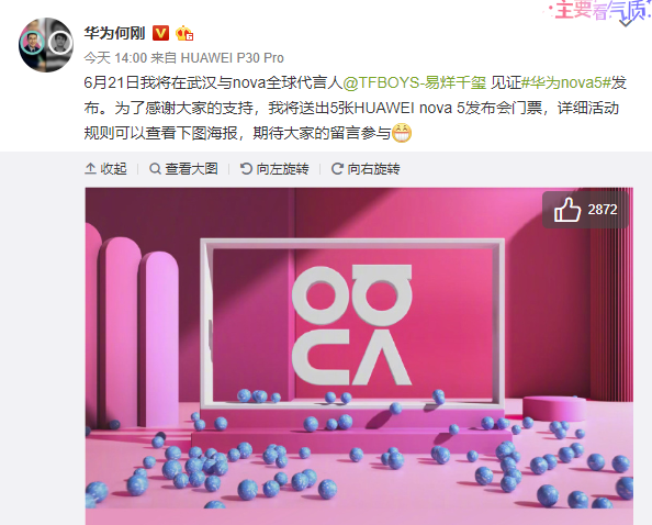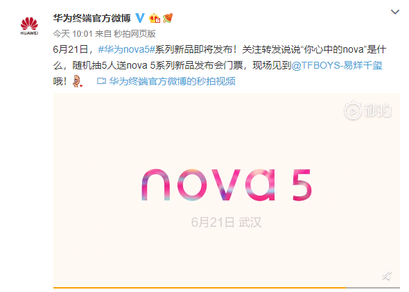 6月11日下午2点,华为终端手机产品线总裁何刚在个人微博表示:6月21日我将在武汉与nova全球代言人@TFBOYS-易烊千玺 见证#华为nova5#发布。