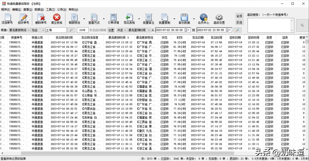 4. 强大的分析功能:这款软件不仅提供了基本的查询功能,还配备了强大的分析功能。你可以对延误件、提前签收、派件时效等进行分析,快速找到问题快递和优化物流流程的瓶颈点。