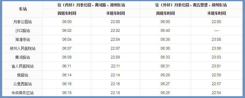 从郑州地铁5号线时刻表可以看出,5号线的运营时间在6:00~23:08,其中内外环的时间也不一样。郑州地铁5号线比较特殊的是,由于它的站台围成了一个环状线,因此5号线的始发站和终点站都是同一个,即月季公园站。
