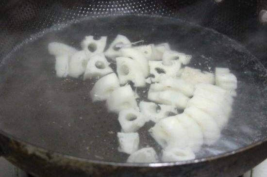 热锅烧开水之后,把莲藕放入沸水里烫煮三分钟,捞出莲藕片之后沥干水分。注意焯煮莲藕的步骤很重要,因为焯煮后的莲藕不会发生氧化,就不会变色。