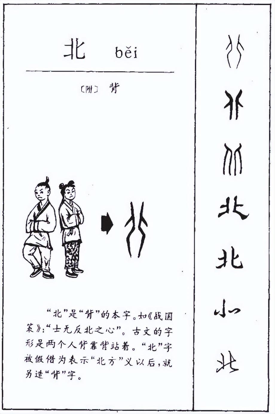 北字最早见于商代甲骨文,会意字。“北”,像两人相背(请注意,是相背的)。以后的甲骨文、金文、小篆、隶书和楷书,都是根据这二人相背的形象演变而来的。金文大同。篆文整齐化。隶变后楷书写作“北”。“北”的本义是互相违背。其字源演变图如下: