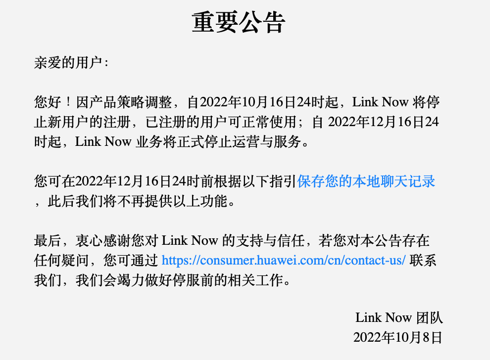 此前,Link Now已于10月16日24时起停止新用户的注册,不过已注册的用户仍可正常使用。已注册用户可在12月16日24时前,保存本地聊天记录。华为官网提供了Link Now导出聊天记录的操作步骤:打开会话,点击右上角进入聊天设置或群组设置,点击导出聊天记录,随后打开文件管理>我的手机,依次点击download>LinkNow>Message>Takeout,即可找到导出的聊天记录文件。
