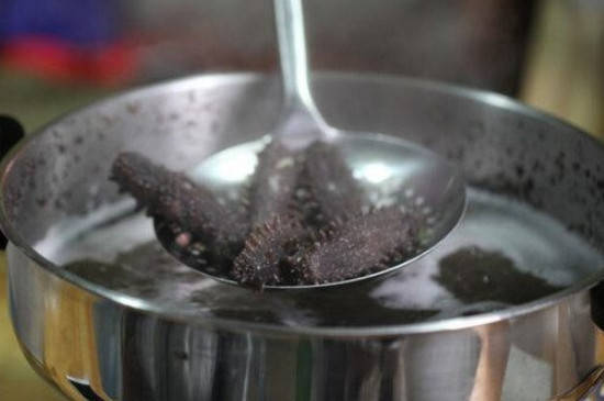 将清洗好的海参放到煮沸的水中煮45分钟左右,待海参缩小,用手摸时感觉有弹性时捞出。再把海参放到淘米水中继续煮1~2小时,淘米水可以软化海参肉质,去腥臊。