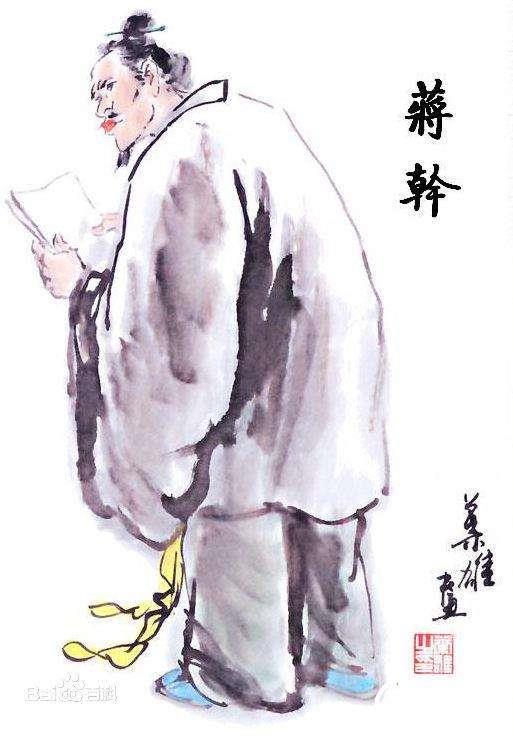 《三国志·周瑜传》裴注引《江表传》描述蒋干“有仪容,以才辩见称,独步江、淮之间,莫与为对”。当初,曹操听说周瑜年少有美才,于是密下扬州,派九江蒋干去见周瑜,希望能劝说周瑜离开孙权投奔自己。