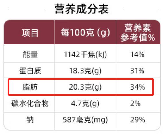 -可能会长胖:别小看了烤肠,它可是高能量高脂肪的食物。就比如下图这一款电商平台卖得还挺火的某品牌烤肠的营养成分表,脂肪含量高达 20.3g/100g,是猪瘦肉的 3 倍多,热量为 273kcal/100g,吃 1 根烤肠(约 50g),摄入的热量可不低,相当于 1 小碗蒸米饭呢,得跑步 20 分钟才能消耗掉。