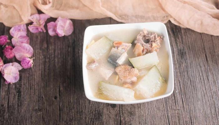 冬瓜鸭掌汤是一道非常营养滋补。适合炎热的夏天,煲点清淡的汤水滋养一下 。鸭掌含有丰富的胶原蛋白,和同等质量的熊掌的营养相当。掌为运动之基础器官,筋多,皮厚,无肉。筋多则有嚼劲,皮厚则含汤汁,肉少则易入味。从营养学角度讲,鸭掌多含蛋白质,低糖,少有脂肪,所以可以称鸭掌为绝佳减肥食品。”