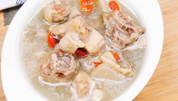6、锅中放入鸭肉,炒干水分,盛入汤锅中,加入姜片、葱结、花椒、适量清水大火煮开,换小火慢炖1小时,放入酸萝卜炖30分钟,加入枸杞、鸡精半勺拌匀即可。