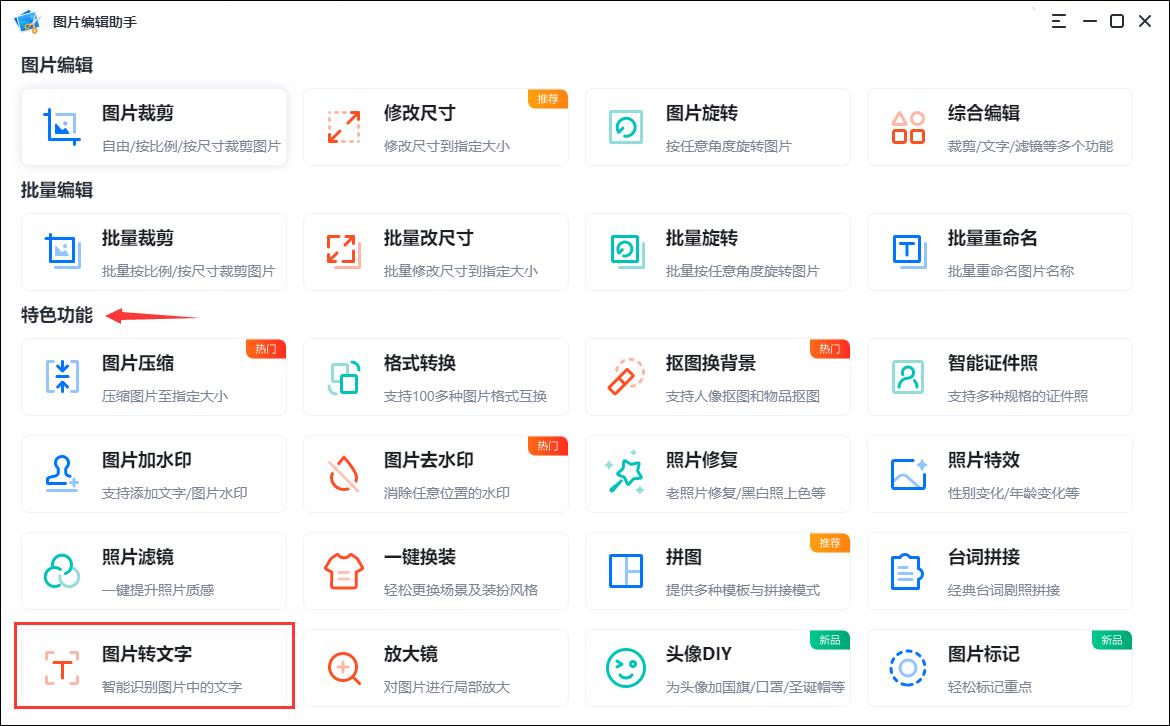 ①:电脑上打开【图片编辑助手】工具,进入首页,找到“特色功能→图片转文字”。点击添加文字图片,选择好后,就可以进入功能页面了。