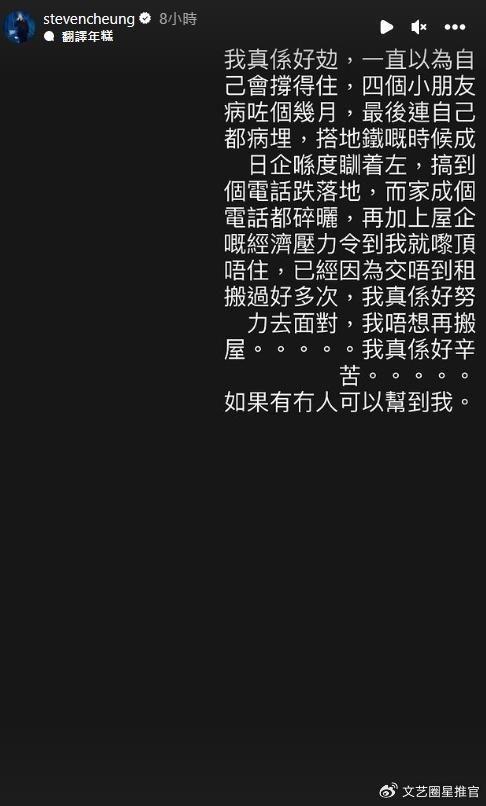 一波未平一波又起,贫穷的坎儿还没迈过去,张致恒一家又再次病倒了。在12月18日凌晨的限时动态中,张致恒发布了一张黑底白字的信,文字中流露出他的求助心声:“我真的很疲惫,曾以为能够坚持下去。孩子们生病了好几个月,最终我也被拖垮。在地铁上,我常常因为疲劳而站着入睡,手机也时常掉在地上,现在整个手机都碎了。加上家庭的经济压力,我已经快无法承受了。由于支付不起房租,我已经搬家很多次了,我真的很努力地去面对,但我不想再搬家……我真的很辛苦……如果有好心人可以帮助我……”
