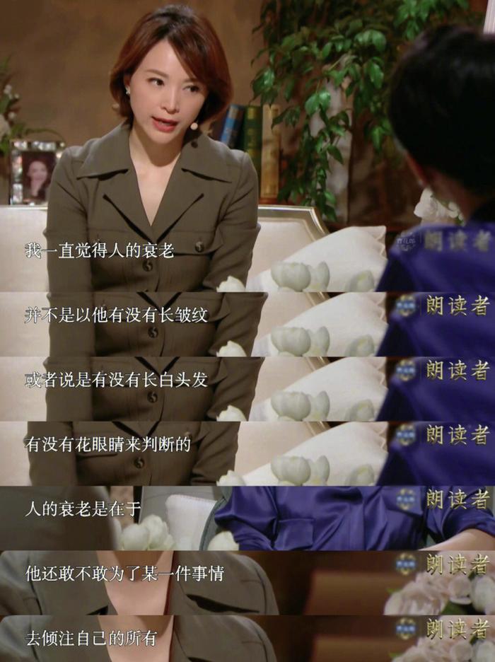 周迅说:“难过,我当然难过,但是确实在那个时间段面临衰老这个问题。我只能往前走,我们每个人都只能往前走,对吧,要不然我们挑个恰恰,往后退两步再往前走。我一直觉得人的衰老并不是她有没有长皱纹,或者说是有没有长白头发,有没有花眼睛来判断的。人的衰老是在于他敢不敢为了某一件事去倾注自己的所有。”