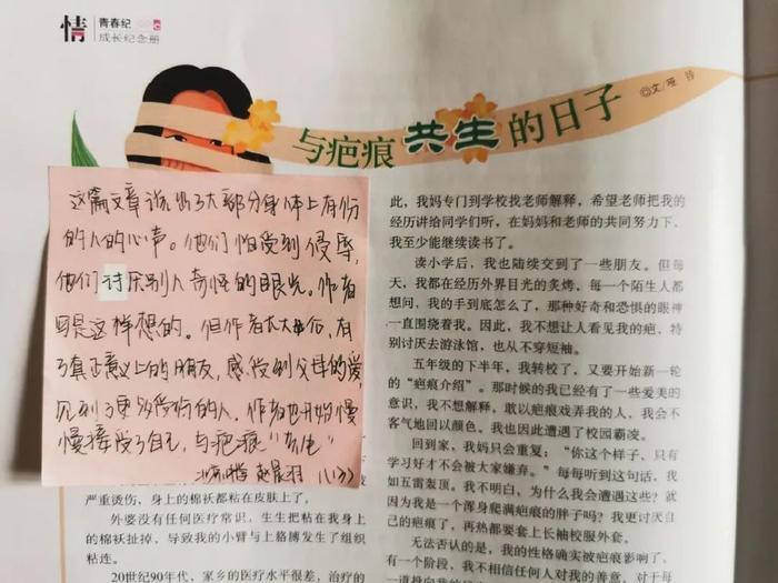 △赵晨羽同学在我身上贴了一张字条,说她对“”产生了共鸣,想着如何与自己身体的不完美和解。与疤痕共生