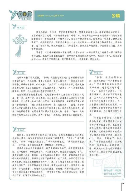 △在冯淑娟老师的指导下,北京陈经纶中学的学生钟天琪、李汶曦、袁雨安、郭佳怡,以乡情为主题创作的作品,刊登在2022年第3期《青年文摘·彩版》