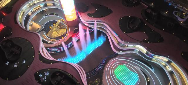 除了广场,在商场二、三楼的室内,透过玻璃窗,也能看到跌宕起伏的喷泉光影表演。