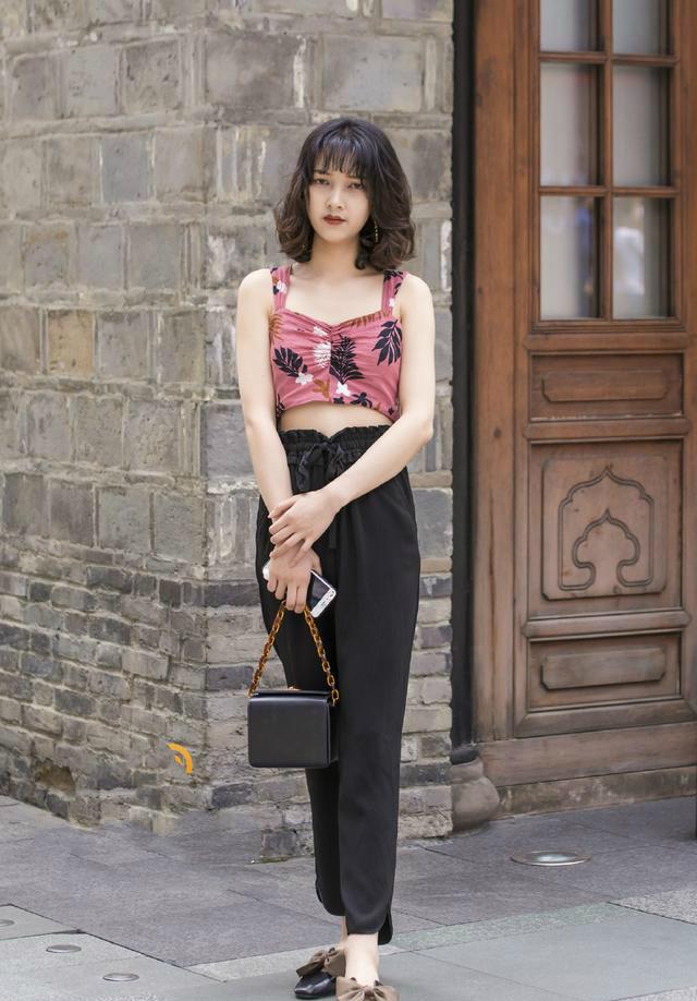 街拍:图三美女身穿红色吊带抹胸,黑色长裤更显身材苗条性感
