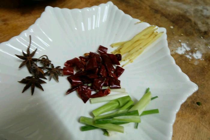 为了创造酱油鸡爪的独特风味,我们首先需要准备一份秘制的底料。在高压锅的底部,摆放四颗香气四溢的八角,添上少量辣椒节,再加入两根切段的葱和一块切成丝的姜。这些美味的香料将为鸡爪注入深厚的风味。