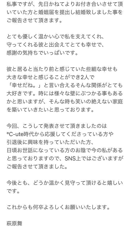 8月2日,25岁萩原舞在社交平台发文,宣布结婚喜讯,并配文称:“虽然是私事,前些天宣布与以前交往的对象提了结婚,与他相遇我感到非常幸福,他会以温柔温暖的心支撑着守护着我,对他充满了感激的心情。和他在一起感觉理所当然细小琐碎的事情也能感受到巨大的幸福,两个人一起说着真幸福啊。我非常喜欢这样的关系。虽然有时我们之间也会碰到各种各样的障碍,但是我也想要在这种时刻建立一个笑声不断的家庭。多亏了从°C-ute时代开始支持我的人、退出娱乐圈后对我有兴趣的人还有平日关照我的人,才有了现在的我,所以向大家发表了这件事。今后大家能继续温暖地守护我,我会很开心的。今后也请多多关照。”