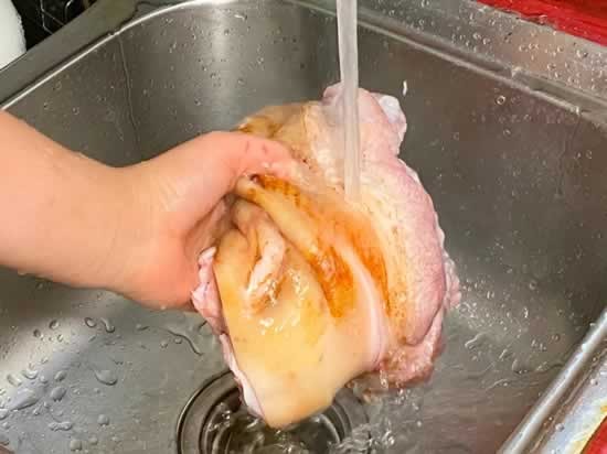 大概焯水五分钟的时间,现在锅中漂浮着很多的浮沫,用勺子将浮沫撇干净。这些浮沫,都是肘子里面的血水,撇干净之后,开大火再组织一分钟时间,将猪肘子捞出来,用流动的清水给它冲洗干净,然后放在一旁备用