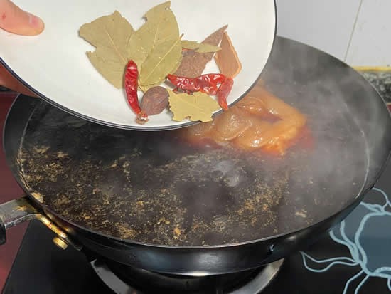然后再一次性加入没过猪肘子的开水,在往锅里面下入八角,香叶,桂皮,姜片盖上盖子组织半个小时的时间,这个时候打开盖子,把里面的桂皮,香叶,八角都捞出来。因为他们都已经煮出香味了。