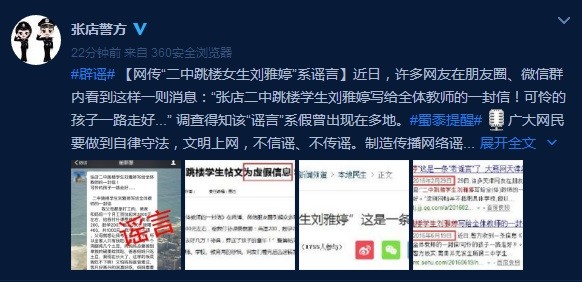 齐鲁网12月9日讯 近日,许多网友在朋友圈、微信群内看到这样一则消息:“张店二中跳楼学生刘雅婷写给全体教师的一封信!可怜的孩子一路走好...” 。今天,淄博市公安局张店分局官方微博 @张店警方发布辟谣信息,证实这是一则“老谣言”。也提醒广大网民要做到自律守法,文明上网,不信谣、不传谣。制造传播网络谣言要承担相应的法律责任。