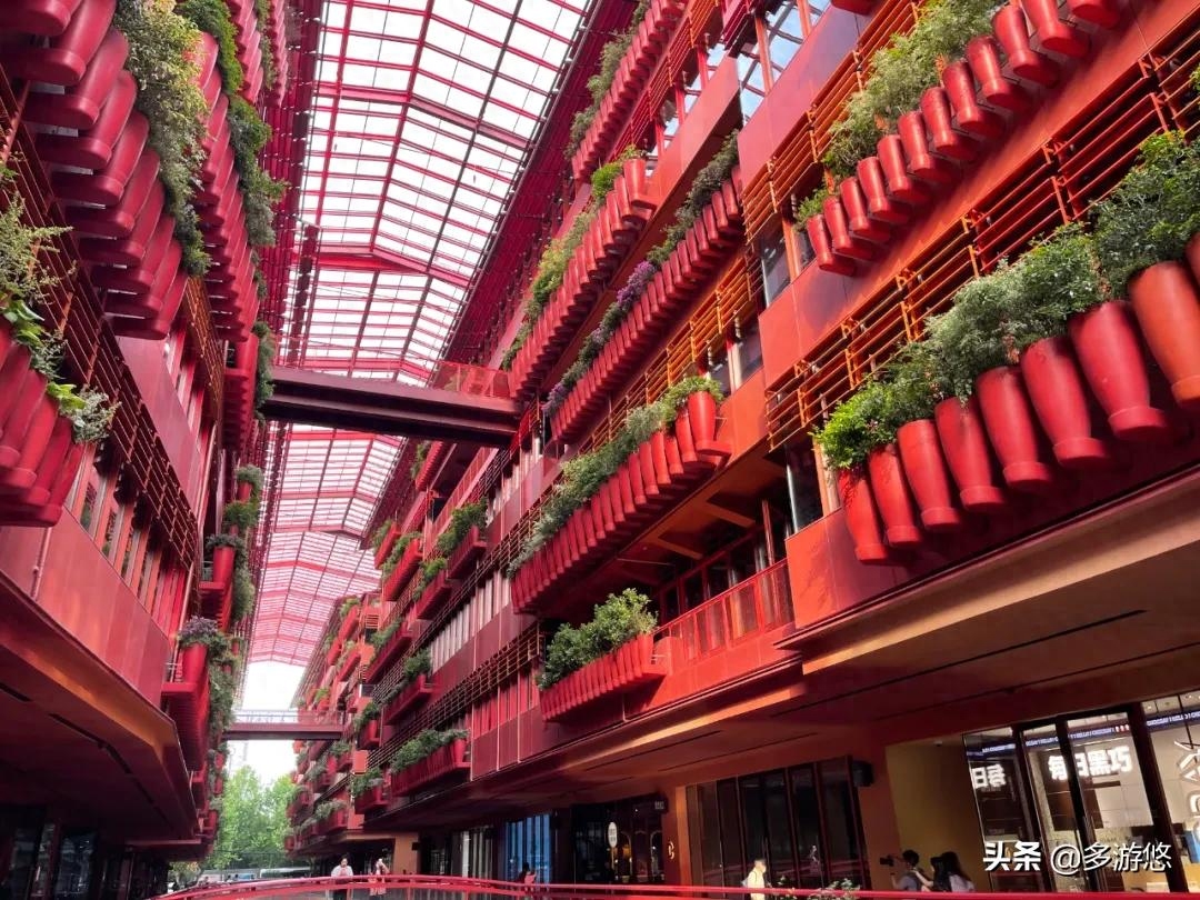 (1)由两座建筑构成,一条街道贯穿其中,内街采用张扬的丹霞红,约2500个花钵垂直绿化塑造了绿植外立面,富有特点的建筑既能成为社交聚会的空间,也适合周边居民白领散心和沉思。