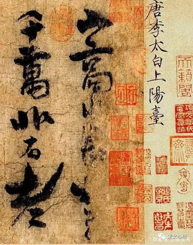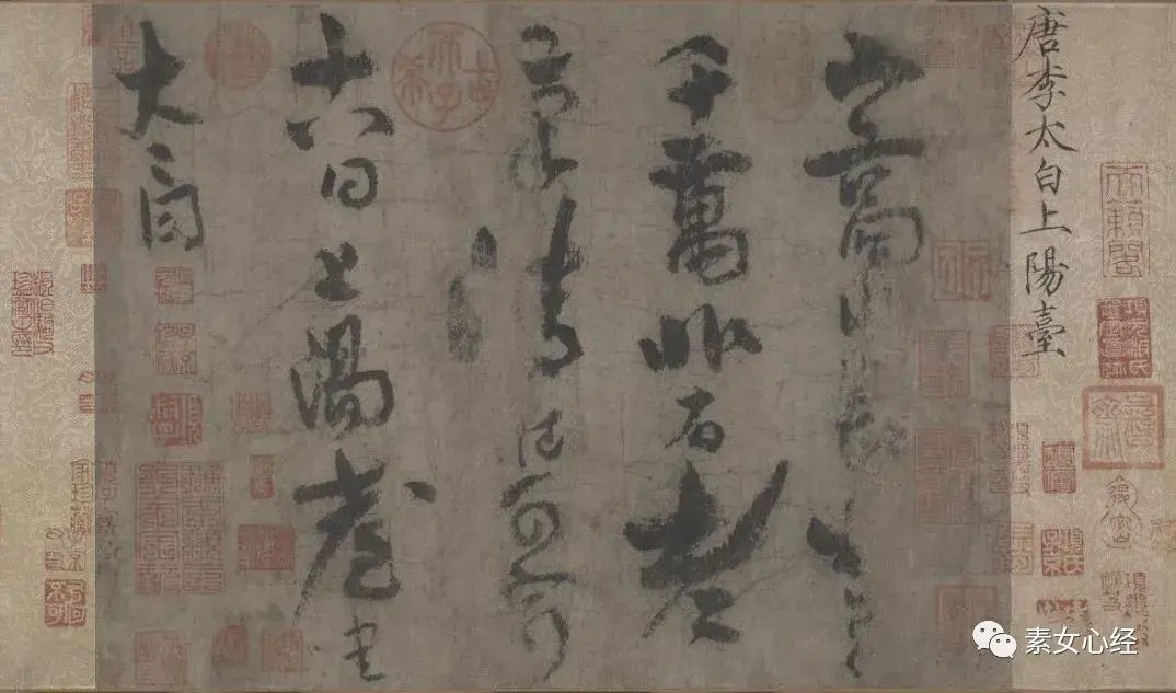 然而,大部分人所知是李白的诗文,却不知李白的书法同样雄隽华赡,非比寻常。《宣和书谱》记载:李白书法作品有行书《太华峰》,草书《岁时文》《咏酒诗》《醉中帖》。并载:“白尝作行书,字画尤飘逸。”可惜的是,这些作品已失传。不幸中之万幸,是至今尚可见李白唯一存世墨迹《上阳台帖》。