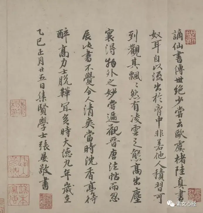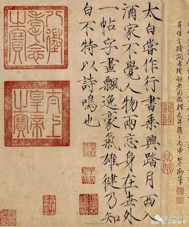 我觉得元代张晏的跋文亦精彩:“谪仙(李白)书传世绝少,尝云,欧、虞、褚、陆真书奴耳。自以流出于胸中,非若他人极习可到。观其飘飘然有凌云之态,高出尘寰得物外之妙。尝遍观晋,唐法帖,而忽展此书,不觉令人清爽……“