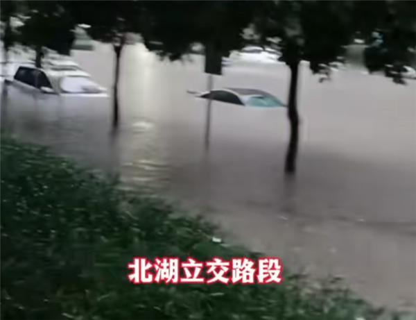网友拍摄的视频显示,北湖立交路段道路积水严重,有车辆已经被淹没至车顶。