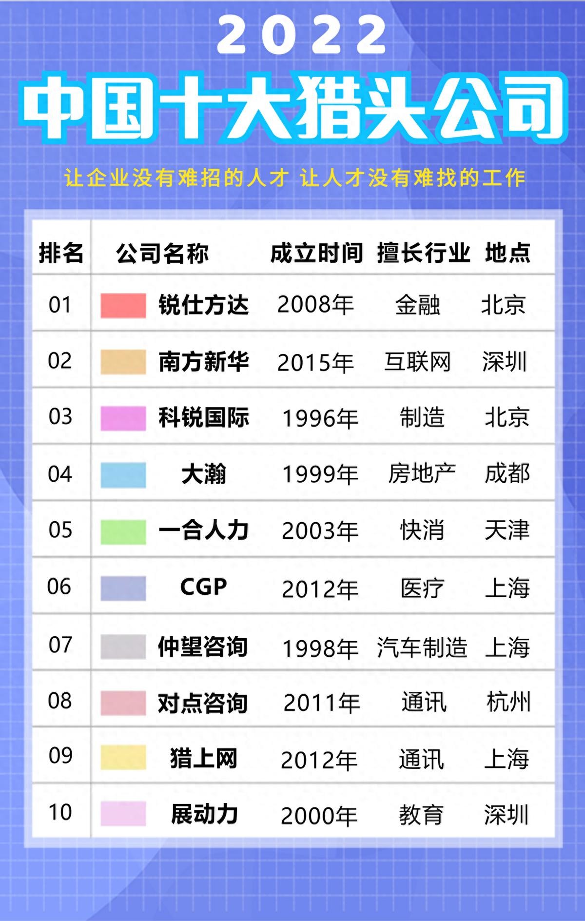 2023经济的恢复,社会岗位即将增加。抓住机会 奋发直上。Judy为大家在2023年的开始,整理了一份2022年中国十大猎头公司,希望分享对你有所帮助。