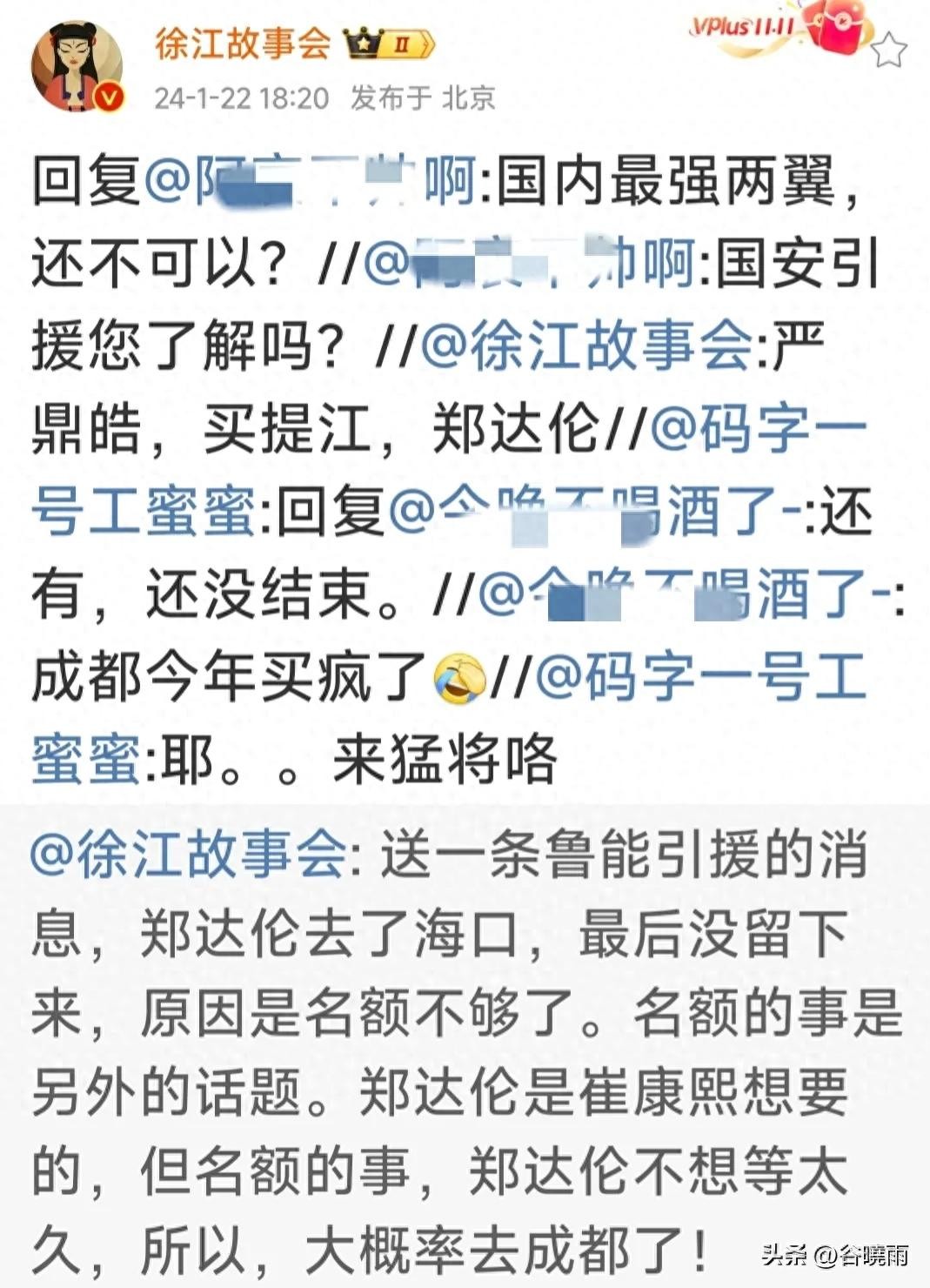 虽然离2月底中超引援窗口关闭还有一个多月的时间,但是24赛季中超各队引援基本进入尾声。媒体人徐江在社交平台和另一位足球媒体人鲁蜜交流时认为北京国安新赛季引援比较成功。