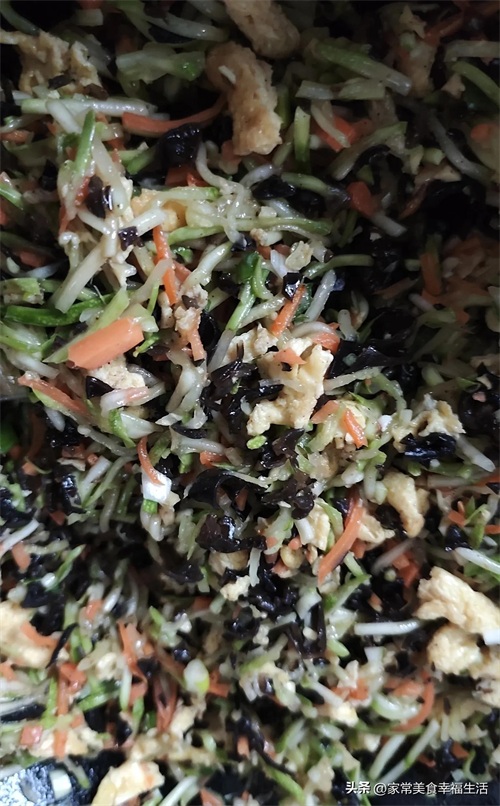 西葫芦丝攥干水分,剁几下,放入炒好胡萝卜丝的锅中,再放入木耳碎丁、鸡蛋块,加适量香油、花椒粉、十三香、蚝油、盐,调好味道,馅就做好了。