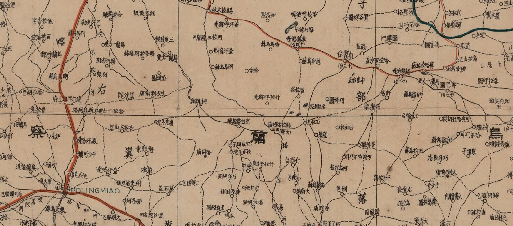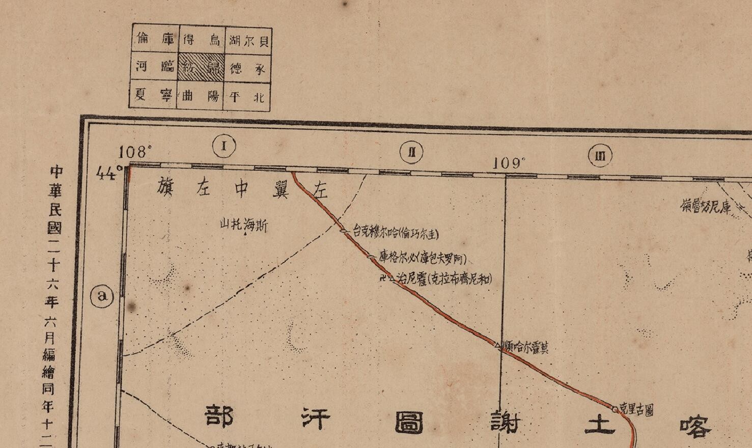 民国二十六年(1937年)内蒙古老地图,图名为归绥(归化绥远),图中包含内蒙古察哈尔省等区域,图中最北部为喀而喀车臣汗部、二连浩特等,左上为喀尔喀土谢图汗部,右上为锡林郭勒盟,中部为乌兰察布盟,左下为伊克昭盟,全图范围四至,请看图片。
