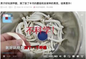 短视频福尔马林平台危害上,博主的食用菌和蔬菜甲醛有区别测试,甲醛。