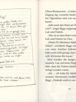 故事中绑匪是英国人,所以对德语的书写习惯或中文的谐音并不敏感,才让求救以用信发到了小虎队手中。而译者在处理这段文字时,不仅要准确地翻译文字,还要重新构思一个适合情景的谜题,真是难为他们如此费心,才为我们带来了念念不忘的好作品。