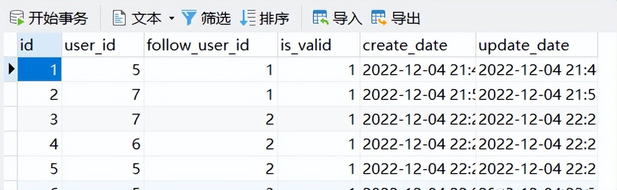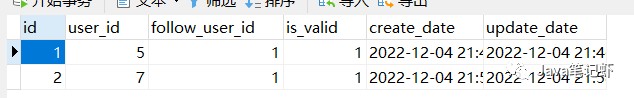 这个数据库表的结构比较简单,主要记录了用户id、用户关注的id和关注状态。
