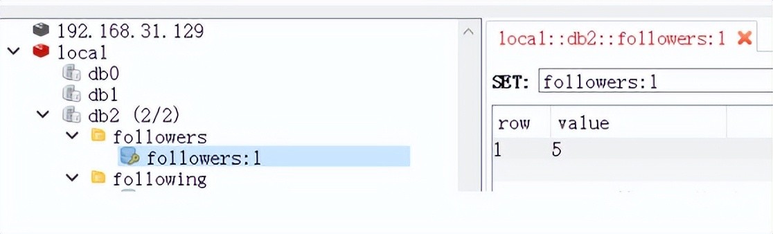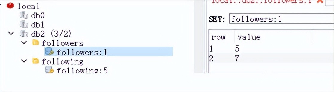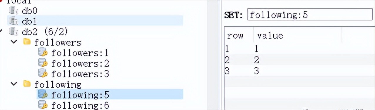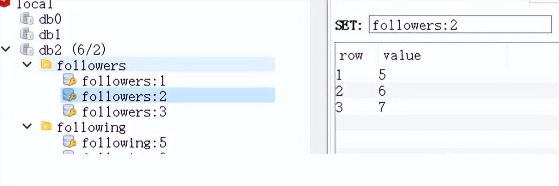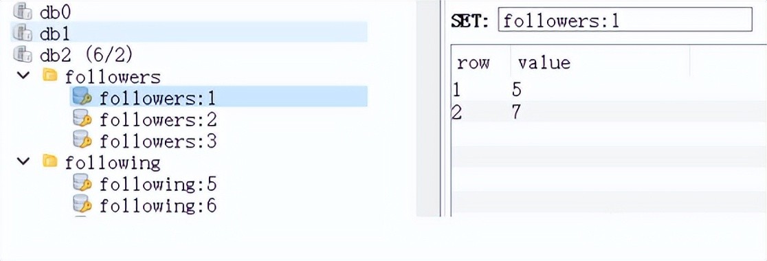 查看redis可以看到有两个集合,一个粉丝集合,一个关注集合。
