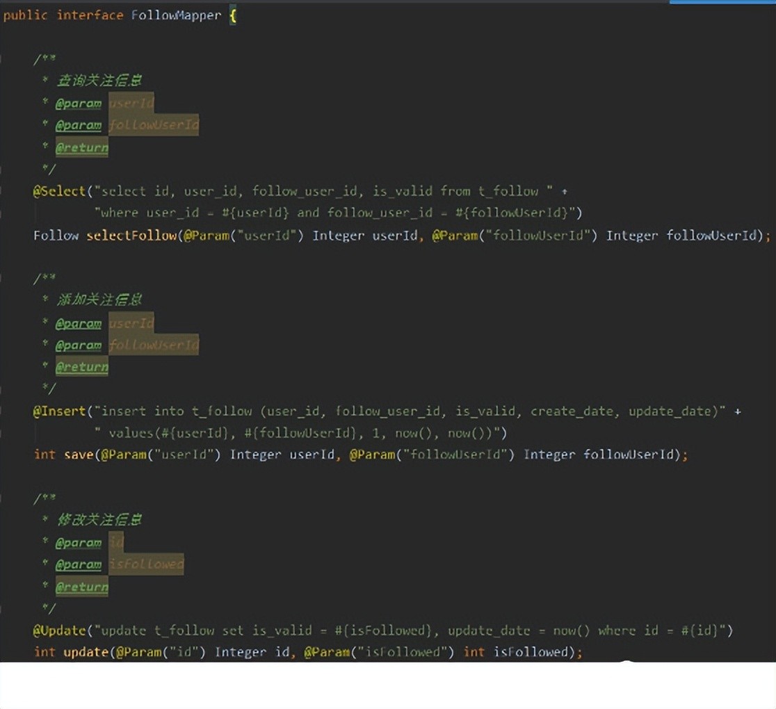 Mapper比较简单主要是查询关注信息、添加关注信息、取关或者再次关注。