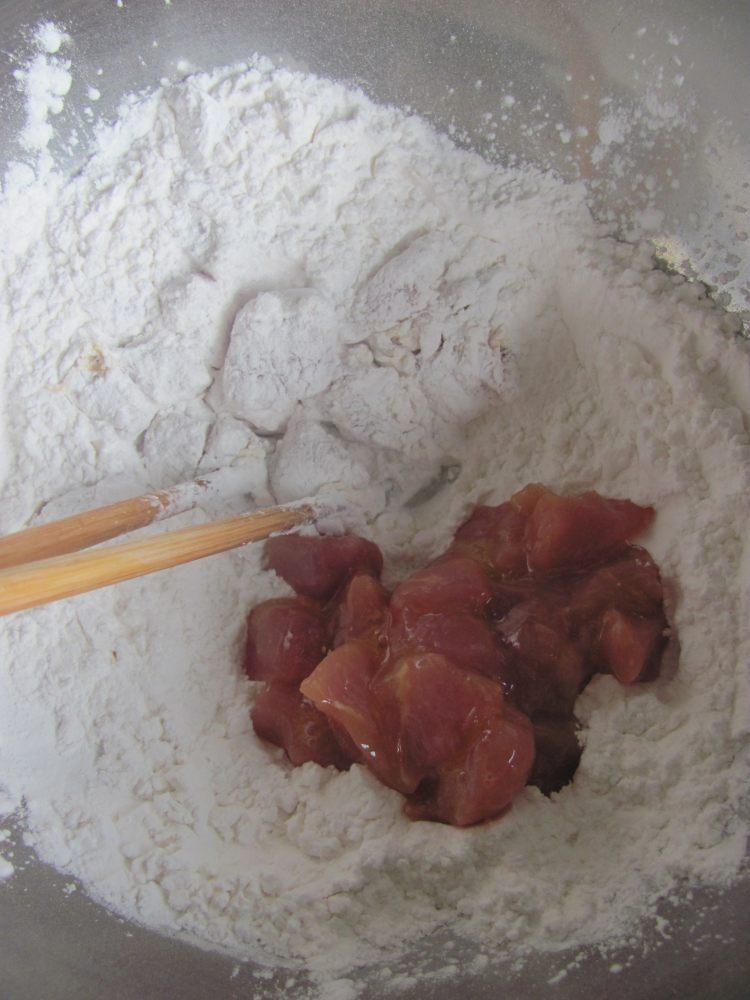 5、然后把肉块倒入淀粉中沾裹均匀。