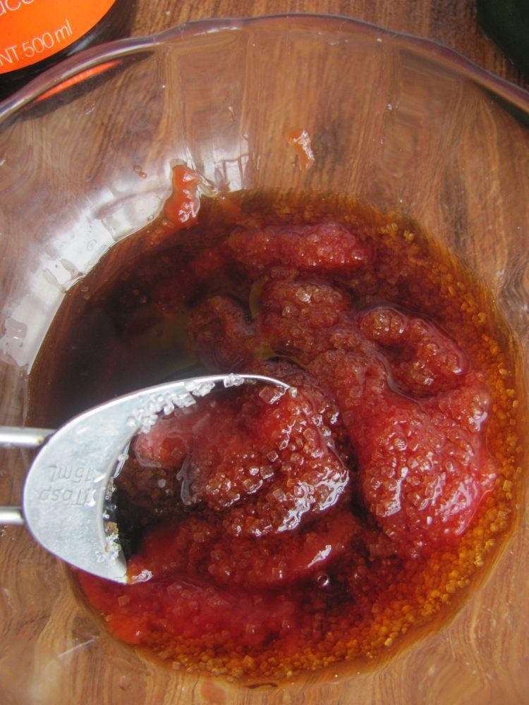 3、取一份小碗放入番茄酱,生抽,米醋,白糖,盐,鸡精搅拌均匀备用。