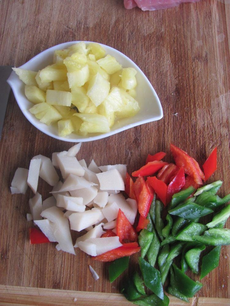 1、菠萝,竹笋切块,青红椒切菱形块。