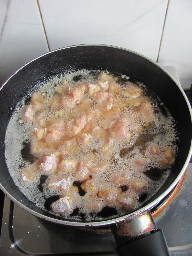 6、锅中油烧热倒入肉块炸制、微金黄捞出。