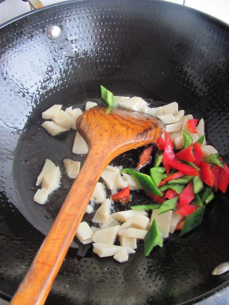 7、锅中倒油烧热倒入笋块和青红椒翻炒过油。