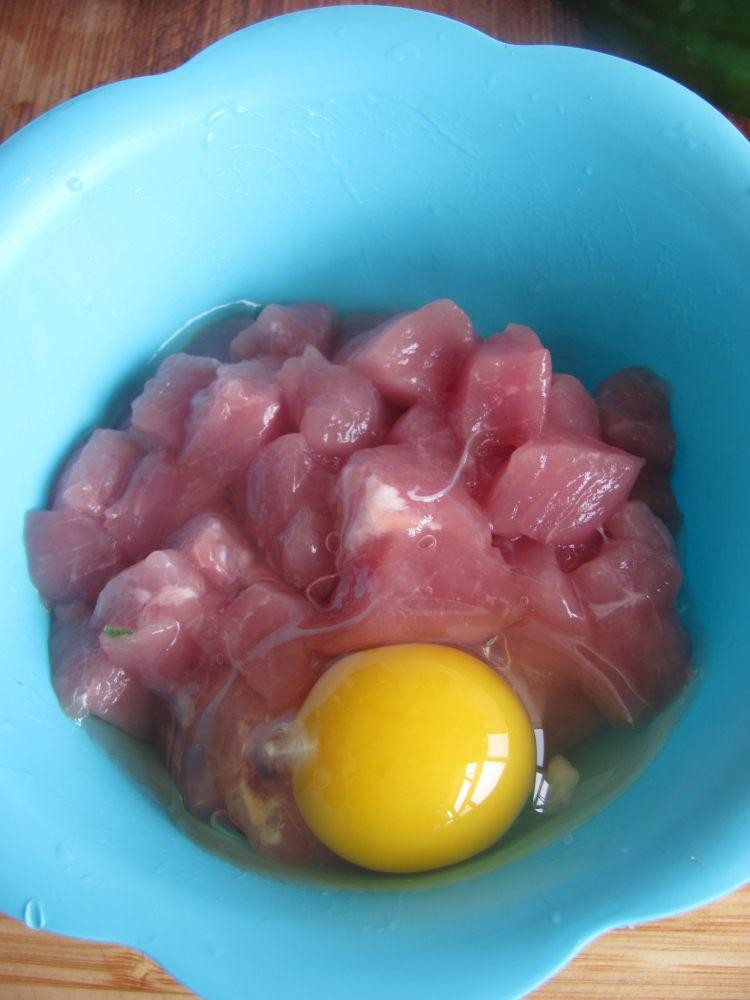 4、腌制的肉中倒入一个鸡蛋拌均匀。