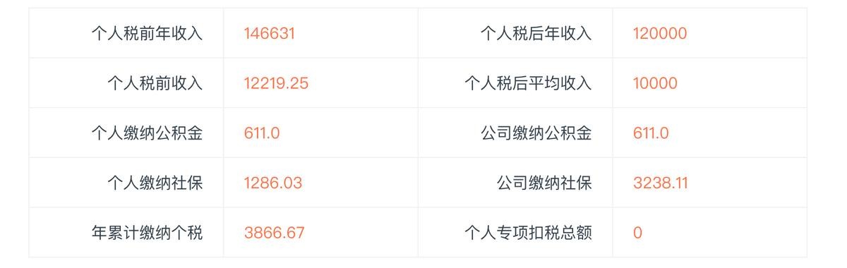 假设一个人期望税后工资为10000RMB,工作地点为北京朝阳,公积金缴纳比例为5%,无子女教育、继续教育、赡养老人、3岁以下婴幼儿照护等,不包括住房贷款、车辆贷款、住房租金等。那么他的税前年收入为14.6万,税后年收入为12万。