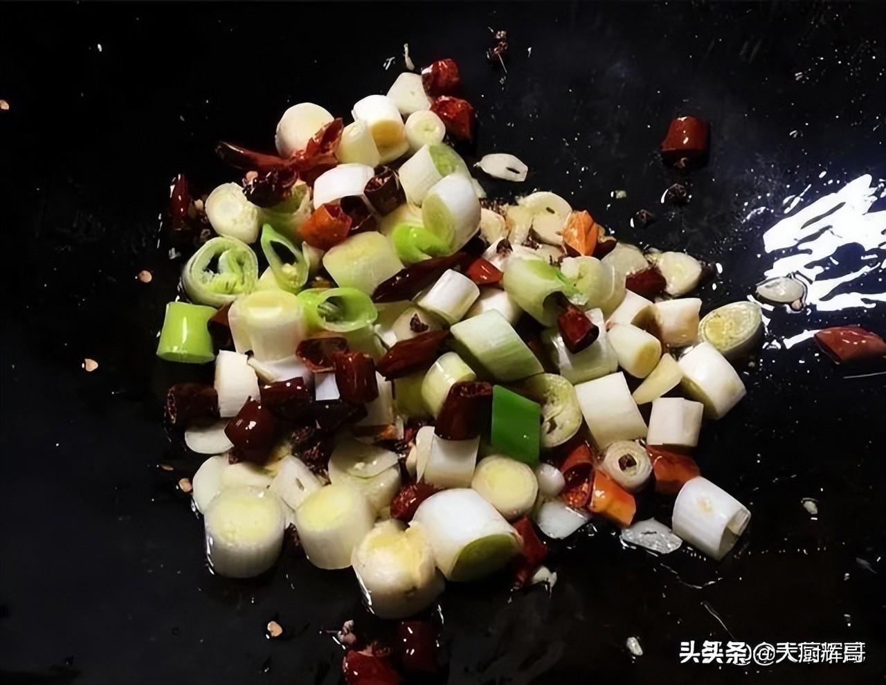8、炒锅洗净后上火,放入姜片和蒜片爆香,放入花椒粒和辣椒段,小火炒至辣椒微有焦糊感时,放入葱丁翻炒片刻。辣椒要炒香呈现焦褐色即可。