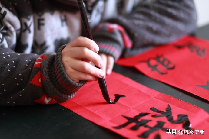当然,如果真要自己写,其实比较麻烦,因为既要买红纸又裁红纸,还要调墨水、准备不同的毛笔,更重要的是,得有人会写毛笔字。