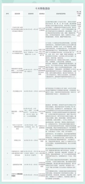十大特色活动,分别为:北京工艺美术博物馆“‘只此东方色’8K数字沉浸展览庙会大集”、中国工艺美术馆中国非物质文化遗产馆“张灯结彩过兔年”新春灯彩会、中国园林博物馆“瑞兔启新岁 园林意趣浓”活动、北京天文馆及北京古观象台“天文馆里过大年”活动、北京汽车博物馆“福兔迎春——我们的节日”活动、中国妇女儿童博物馆“红红火火过大年”民俗活动、中国印刷博物馆“印博过大年”活动、周口店北京人遗址博物馆“福满京城 春贺神州”系列活动、北京励志堂科举匾额博物馆“迎新春民俗市集”活动、北京文旺阁木作博物馆“迎春贺岁•博物馆里幸福年”活动。