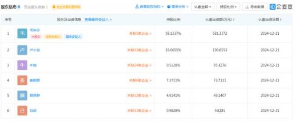 而且根据股权结构来看,天鹅醇雅有6个股东,最大的股东是毛宗志。