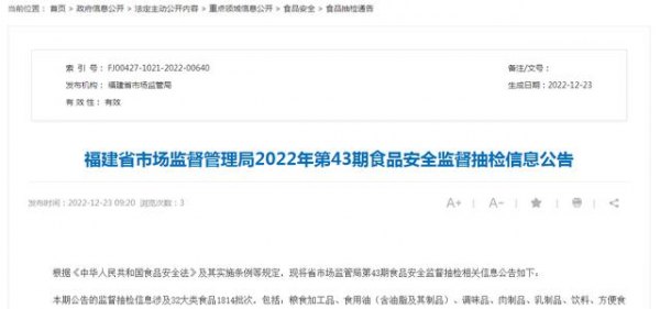 中国质量新闻网讯 近期,福建省市场监督管理局组织抽检32大类食品1814批次。其中抽检酒类23批次,合格23批次。