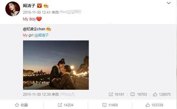 2015 年 11 月底,阚清子和纪凌尘以 "my girl"&"my boy" 的方式公布了恋情。因为当时两个人都比较糊,再加上身为模特的纪凌尘仅仅算是半个圈里人,所以公开官宣情侣关系,并没有给两个人带来什么改变。