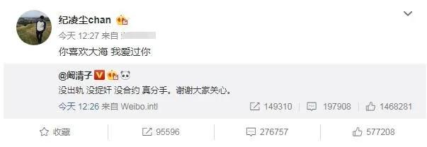 就是分手的时候挺抓马的,当时盛传两人的分手原因是纪凌尘出轨了同为模特的王艺,阚清子不得不出面发文,帮忙辟谣。她自己的辟谣倒是干脆利落,一句话把该说的全说了,就是没料到,纪凌尘临走还要玩一个青春疼痛文学,留下了一句:你喜欢大海,我爱过你。